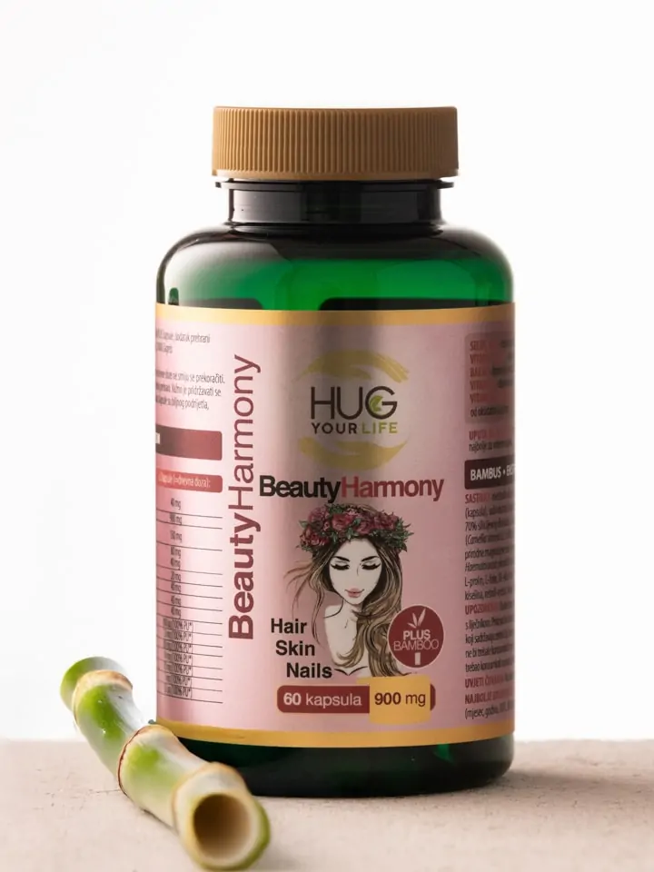 Beauty Harmony – Hair, Skin & Nails je proizvod koji obuhvaća sinergiju čak 15 djelatnih tvari. Svaka kapsula sadrži kombinaciju djelatnih tvari prirodnog porijekla – ekstrakt alge Haematococcus pluvialis (prirodni izvor astaksantina), MSM, ekstrakt bambusa (prirodni izvor silicija) i ekstrakt zelenog čaja (prirodni izvor antioksidansa). Formulacija je dodatno obogaćena hijaluronskom kiselinom, s 3 aminokiseline (L-lizin, L-metionin, L-prolin) te 7 vitamina i minerala među kojima su selen i cink koji doprinose održavanju normalne kose i noktiju te vitaminom A koji doprinosi održavanju normalne kože. Također, u svrhu bolje uravnoteženosti, proizvod ne sadrži vitamine B skupine.