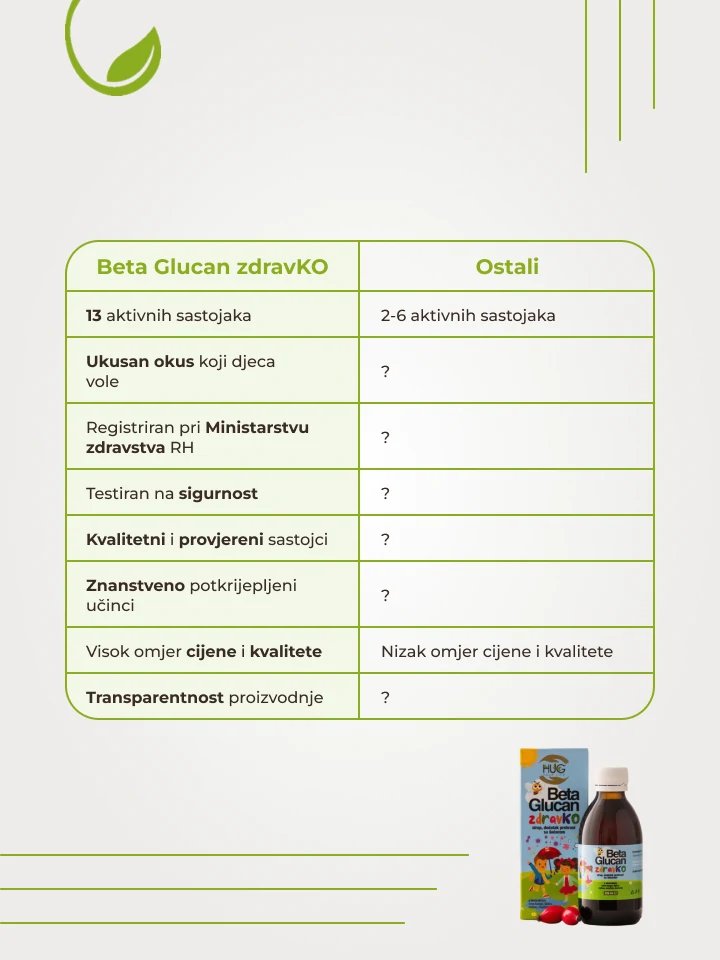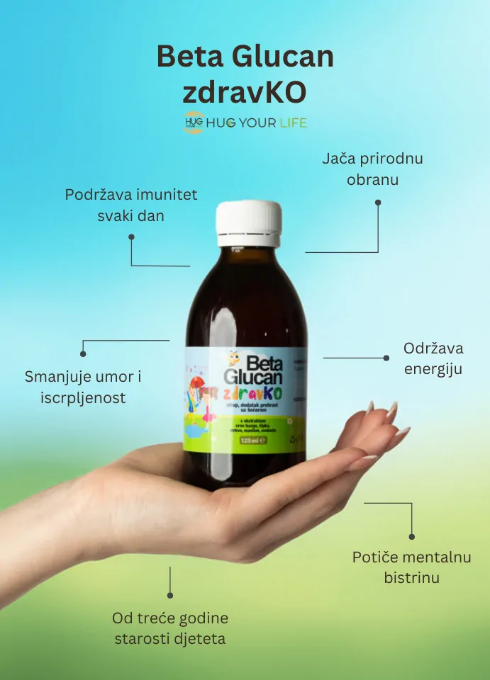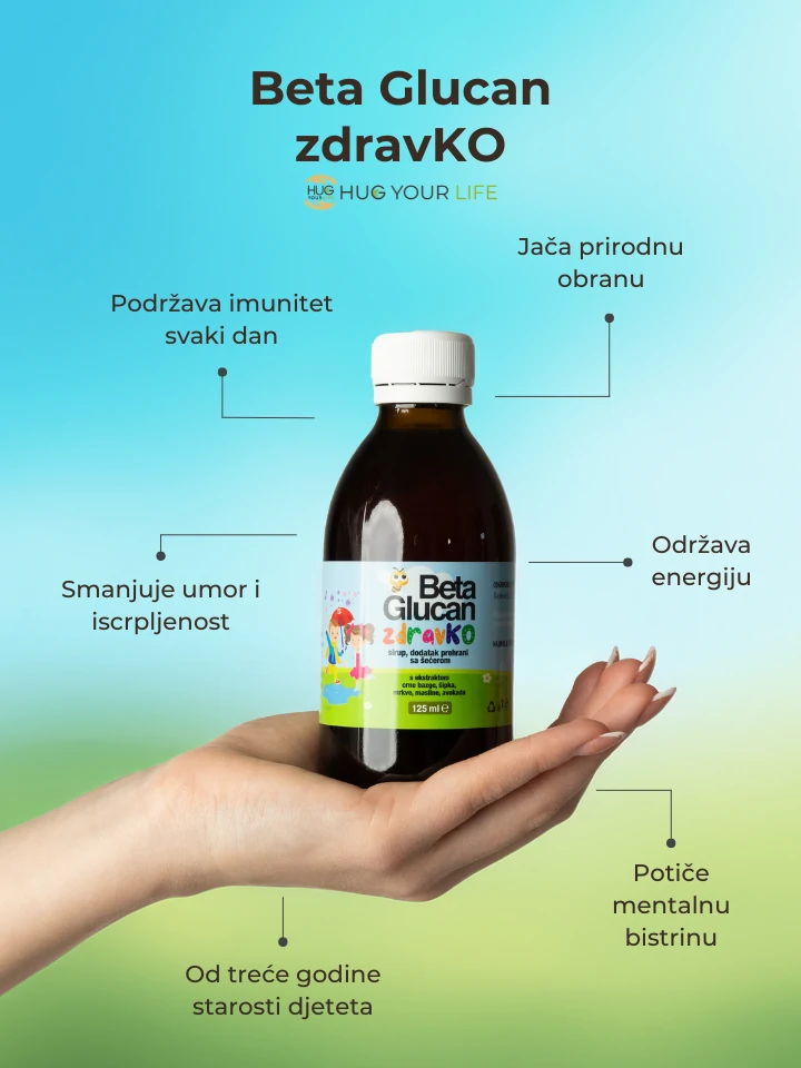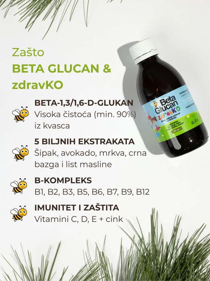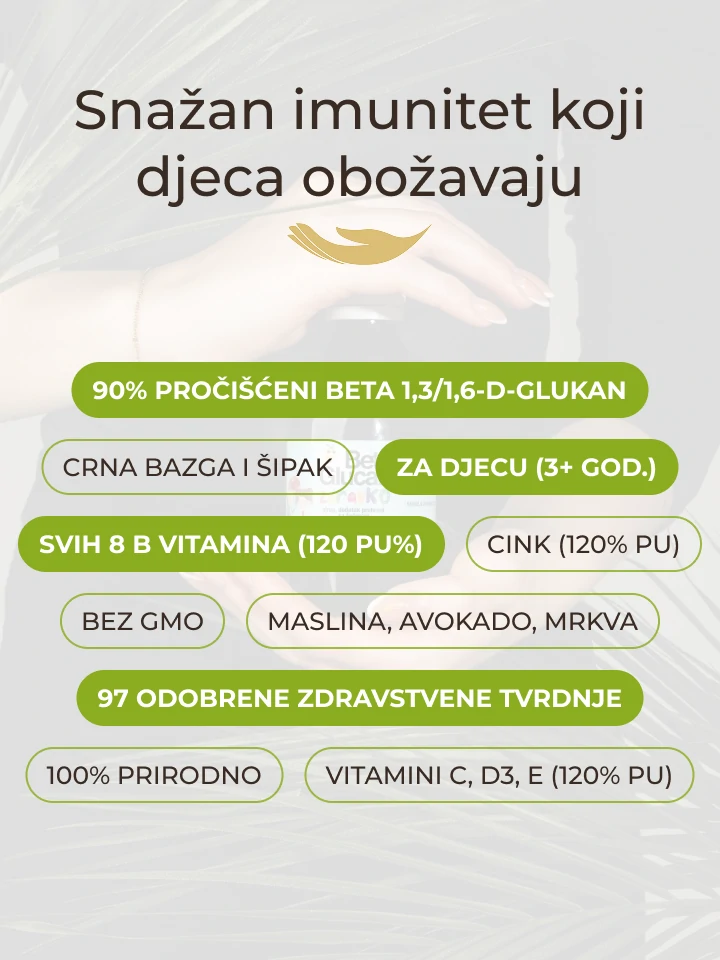 Brinite o imunitetu svog djeteta svakog dana s formulom koja spaja znanstvenu pouzdanost i okus koji mališani rado prihvaćaju. Ovaj ukusan sirup sadrži visoko pročišćeni Beta 1,3/1,6-D-glukan te ekstrakte crne bazge, šipka, mrkve, lista masline i avokada uz pažljivo odabrane vitamine i minerale ključne za normalnu funkciju imunološkog sustava – uključujući vitamin C, vitamin D3, cink i 8 vitamina B skupine.