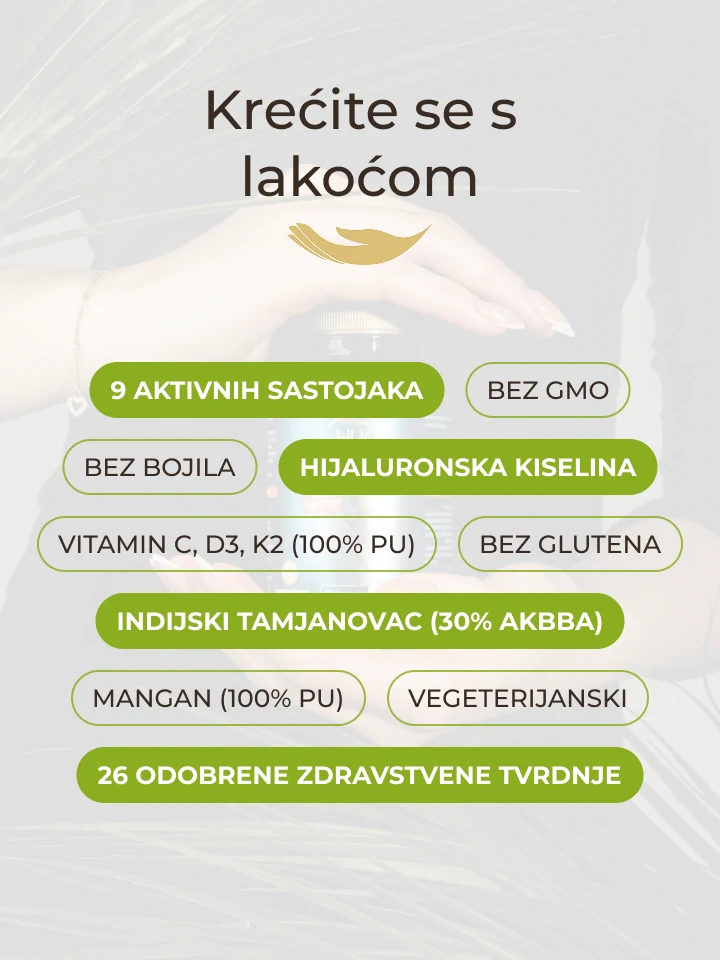 | Suhi ekstrakt smole iz kore drveta Indijskog tamjanovca (Boswellia serrata) standardiziran na najmanje 75% bosvelične kiseline od čega minimalno 30% AKBBA | 80 mg |