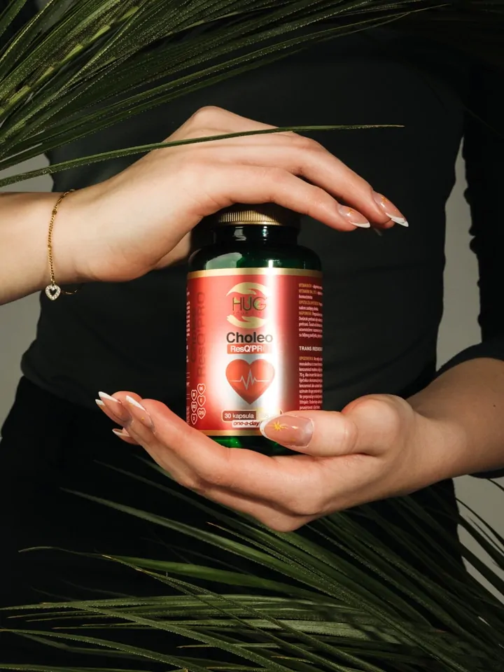 Bocica Hug Your Life Choleo ResQ'PRO dodatka prehrani pored tlakomjera koji pokazuje zdrav puls i tlak