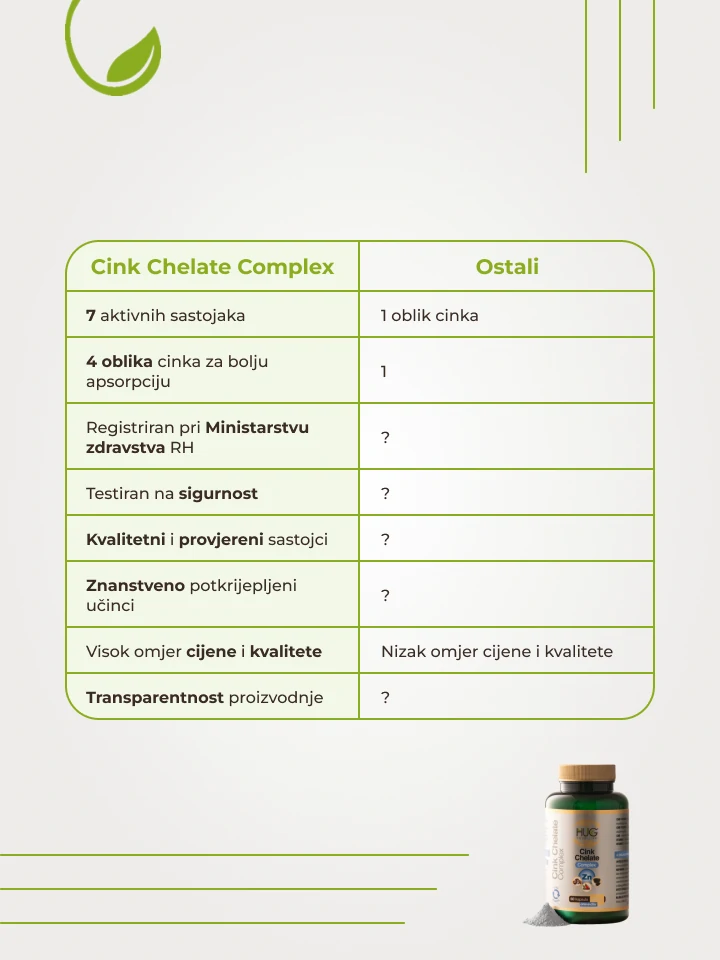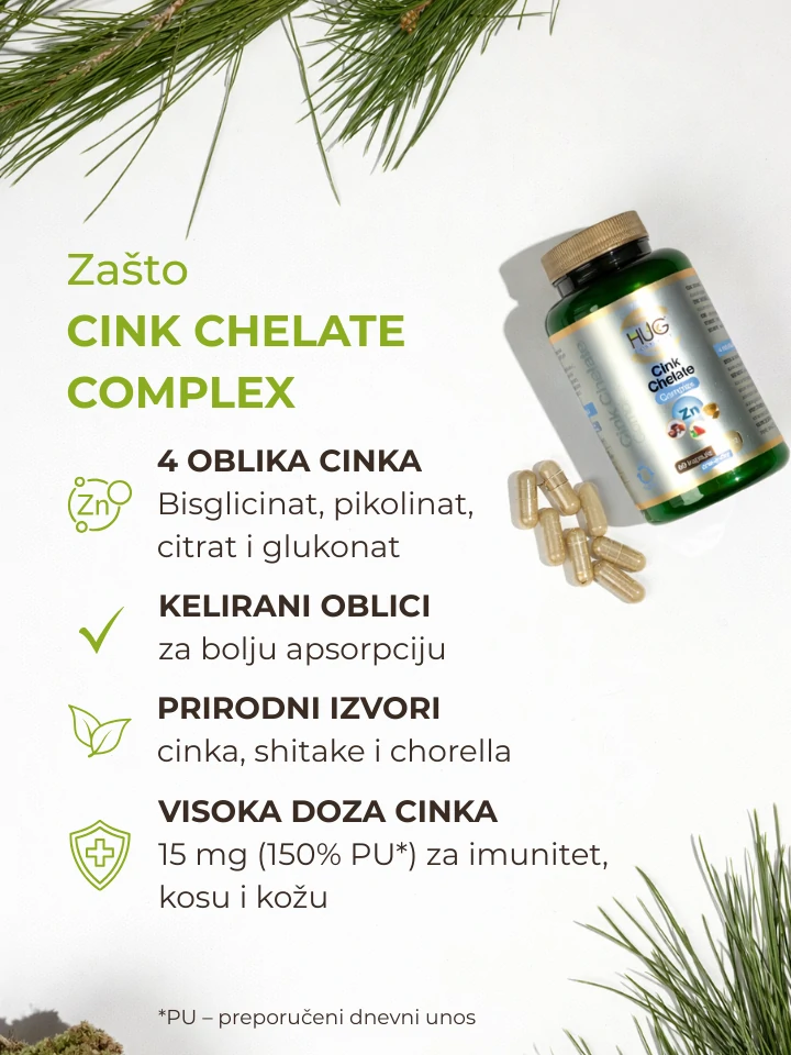 Chlorella je zelena alga koja osim što sadrži visok postotak cinka, u vrlo visokim koncentracijama sadrži još i željezo, kalcij te magnezij. Odličan je izvor vitamina B12, vitamina A, C i E, niacina, klorofila, bakra, selena. Opskrbljuje naš organizam klorofilom više nego ijedna druga hrana, te je stoga moćni “čistač” krvi i detoksikator organizma. S obzirom da sadrži visoki udio omega-3 nezasićenih masnih kiselina, snižava razinu “lošeg” (LDL) kolesterola.