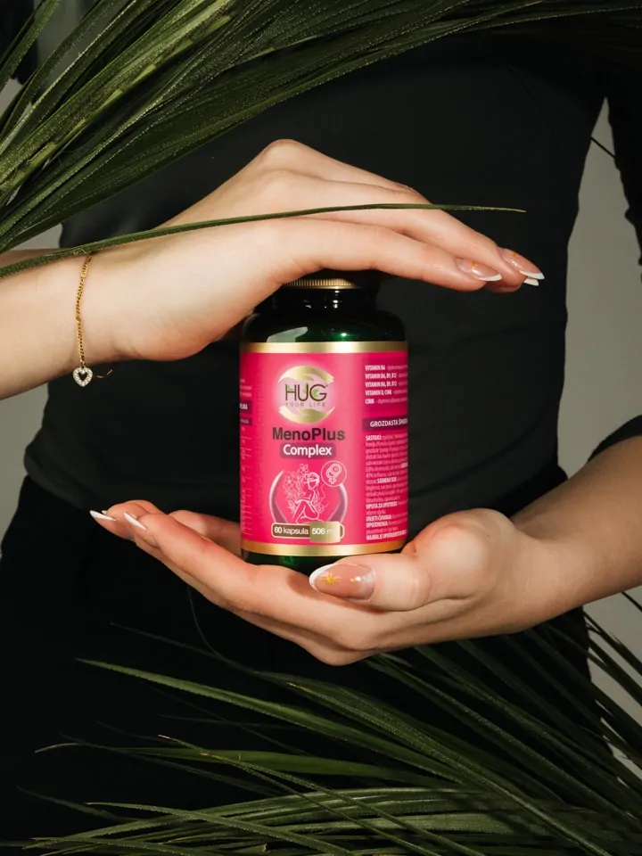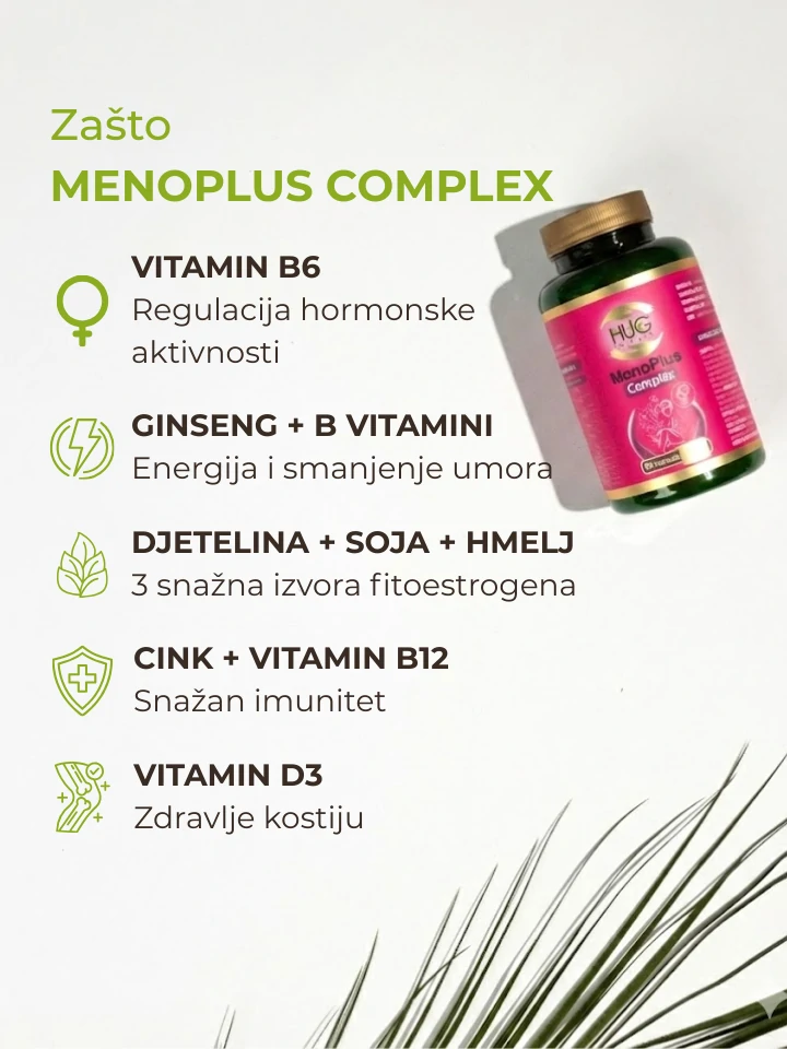 Menoplus Complex sadrži čak 7 biljnih ekstrakata koje svojim sinergističkim djelovanjem pružaju potporu organizmu tijekom perimenopauze, menopauze i postmenopauze. Osim biljnih ekstrakata, obogaćen je vitaminima D3, E, B6, B9, B12 i mineralom cinkom u dozi od 100% preporučenog dnevnog unosa.
