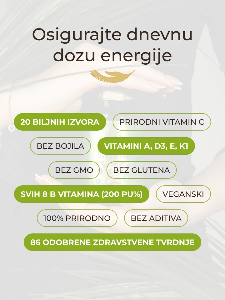 Ova multivitaminska formula kombinira 20 prirodnih biljnih sastojaka s 12 pažljivo doziranim vitaminima, uključujući ključne mikronutrijente za svakodnevnu podršku organizmu. Zahvaljujući čak 86 odobrenih zdravstvenih tvrdnji, predstavlja svestranog saveznika u očuvanju vitalnosti i ravnoteže. Svi sastojci odabrani su prema kriterijima kvalitete, čistoće i funkcionalne uloge u cjelovitom nutritivnom pristupu.
